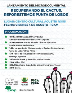 Fundación Punta de Lobos lanza el próximo viernes 04 de agosto desde las 10:00 hrs, en el Centro Cultural Agustí­n Ross, su nuevo microdocumental: “Recuperando el cactus: Reforestemos Punta de Lobos”. El objetivo de este trabajo, realizado en conjunto a Pica Films y Cactus Lagarto, es dar a conocer a la comunidad local el proceso de recuperación de cactus emblemáticos para Punta de Lobos.