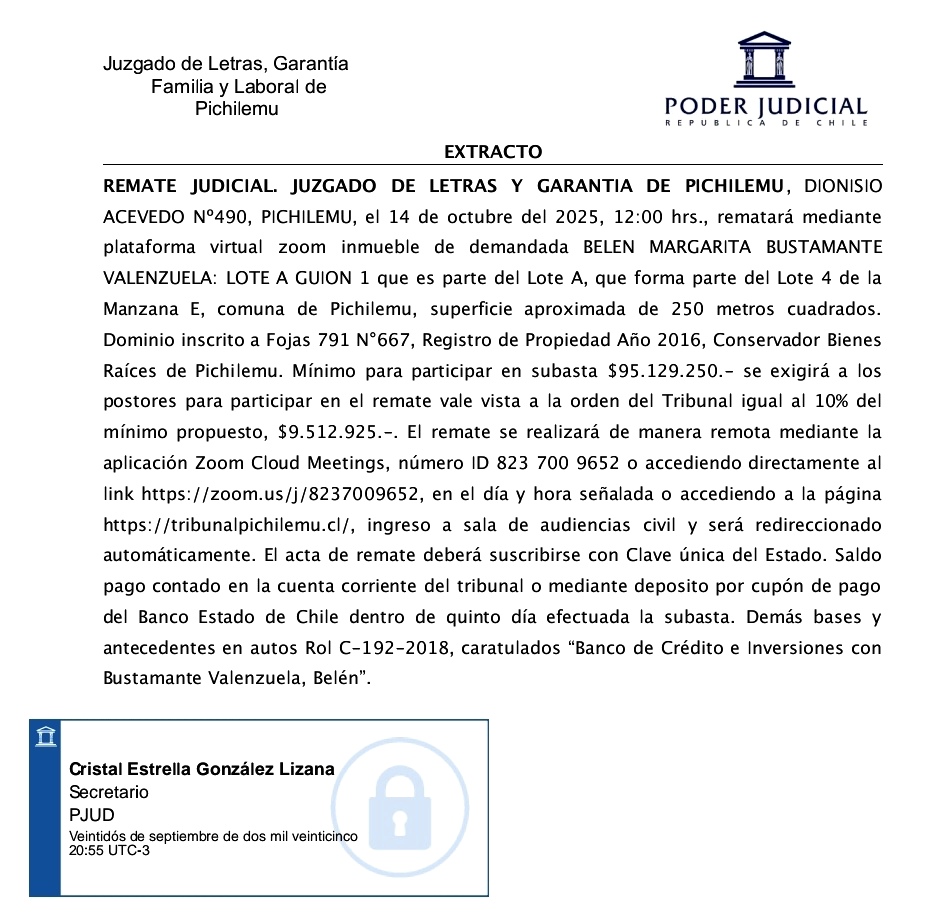 Publicación Legal: REMATE JUDICIAL EN JUZGADO DE LETRAS Y GARANTÍA DE PICHILEMU