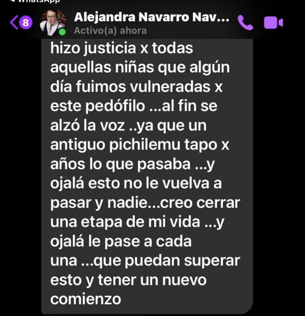 “Hace casi 30 años atrás decidí que este sería un tema del cual jamás volvería hablar porque en su momento sentí que no fuimos escuchados como familia a pesar que se consiguieron cosas no fue suficiente para que 30 años después aún siga siendo un tema para muchas familias que han sido dañadas por este personaje eso es lo que más me duele que muchas niñas hubiesen evitado pasar por algo tan horrible si en ese momento la justicia hubiese hecho algo … al escuchar tantos testimonios y darme cuenta que aplicaba el mismo patrón no me cabe duda que solo en una mente enferma puede existir tanta maldad …no me siento conforme porque podrá seguir disfrutando de una libertad que el por años nos quitó a muchas …el miedo que a pesar del tiempo daba al verlo y toparlo en la calle …Pero si agradecer a una familia que tuvo el valor como nosotros en aquellos años de buscar justicia y a todas quienes decidieron hablar aunque sea en  anonimato porque sabemos que es algo de lo que cuesta hablar …