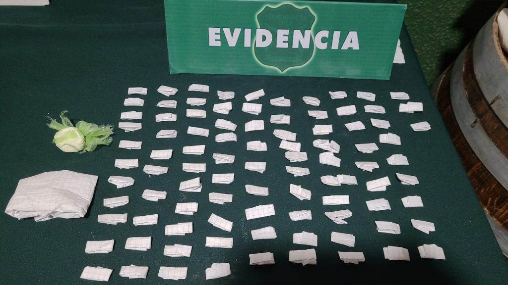 A raíz de este allanamiento se procedió de igual forma a la detención de D.A.G.O., 36 años, por el delito de tráfico de drogas, encontrándose al interior de una mochila la cantidad de 93 envoltorios cuadriculados, un envoltorio color blanco y una bolsa de nylon color verde, contenedoras de una sustancia de color blanco con característica de cocaína.