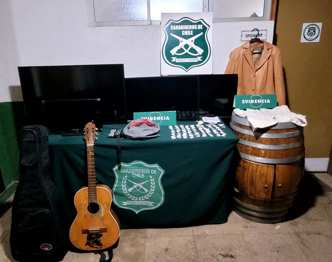 Personal de la Sección de investigación Policial, de esta Unidad, ante denuncia recibida el día 28 de septiembre, por el delito de robo en lugar habitado o destinado a la habitación, de donde sustrajeron una series de especies, entre ellas sombreros, vestimenta de huaso, guitarra, dinero etc., el día de hoy se recibió información que dichas especies se encontraba en un domicilio en la comuna. Estos antecedentes fueron puesto en conocimiento del fiscal de turno, quien autorizó la diligencia del art. 205 del CPP. Personal de servicio, se traslada al domicilio antes indicado ubicado en la villa Santa Teresita de esta comuna, donde se entrevista con su propietario, quien autorizó la diligencia, de entrada y registro, la cual se llevó a cabo entre las 20:10 a 21:30 horas, donde se encontró al interior del inmueble, diferentes especies correspondiente a este delito, asimismo de otros dos delitos ocurridos en esta comuna, pudiendo aclarar un total de tres ilicitos. Con estas evidencias encontradas se procedió a la detención de G.E.P.Y., 50 años, con antecedentes penales por diferentes delitos, C.M.R.G., 29 años, con antecedentes penales, por el delito de Receptación de especies producto de robo.